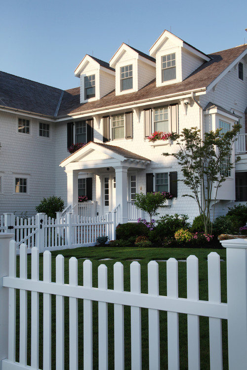 Rounded pickets wrap around this gorgeous seaside home! The humble picket fence doesn’t look out of place in front of this stately house.