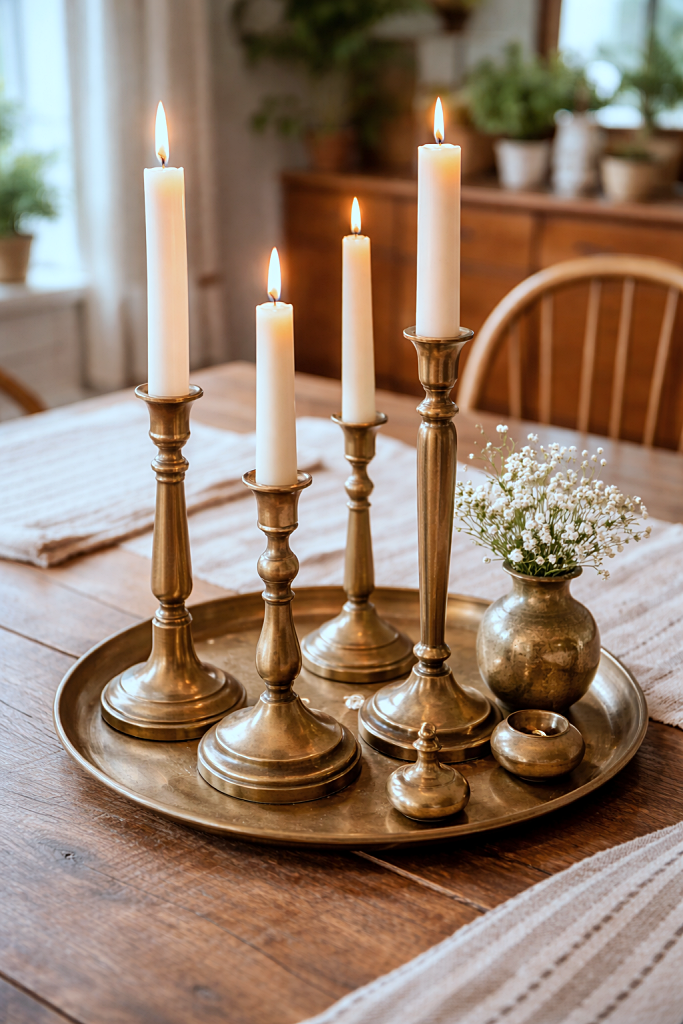 - Brass and gold accents โ Think candlesticks, trays, and picture frames.