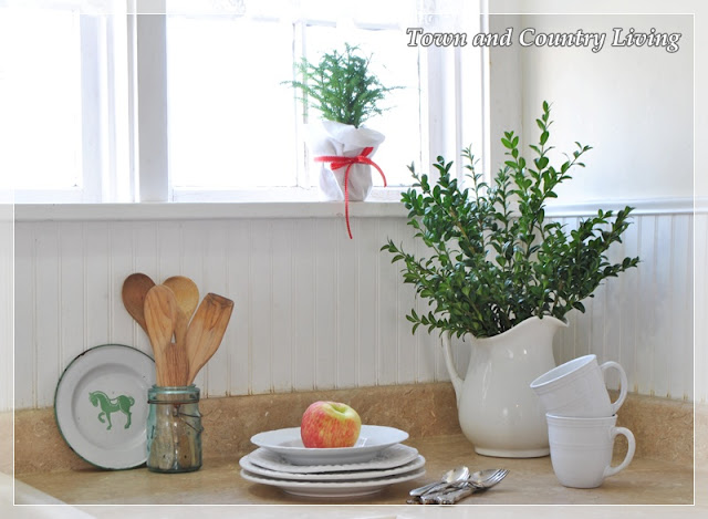 Keeping Christmas simple, I brought touches of greenery into the kitchen. Three little pine trees all in a row, sitting on the windowsill. Leftover boxwood greens from the wreaths I made take up residence in an ironstone pitcher.