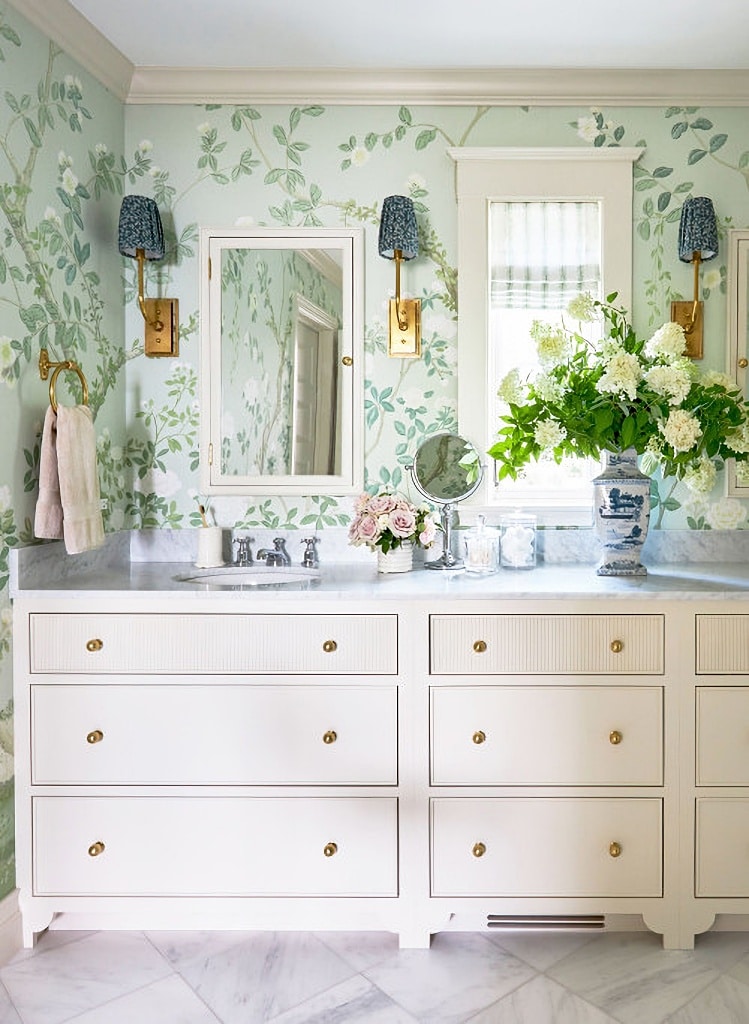 Overall, this floral bathroom is a celebration of contrastโsoft yet structured, traditional yet fresh, playful yet refined. The combination of two wallpapers in complementary patterns is a bold design choice that absolutely pays off, bringing dimension and movement without overwhelming the space. Likewise, the use of natural materials like marble balances the roomโs more decorative elements, keeping the overall look elegant and timeless.