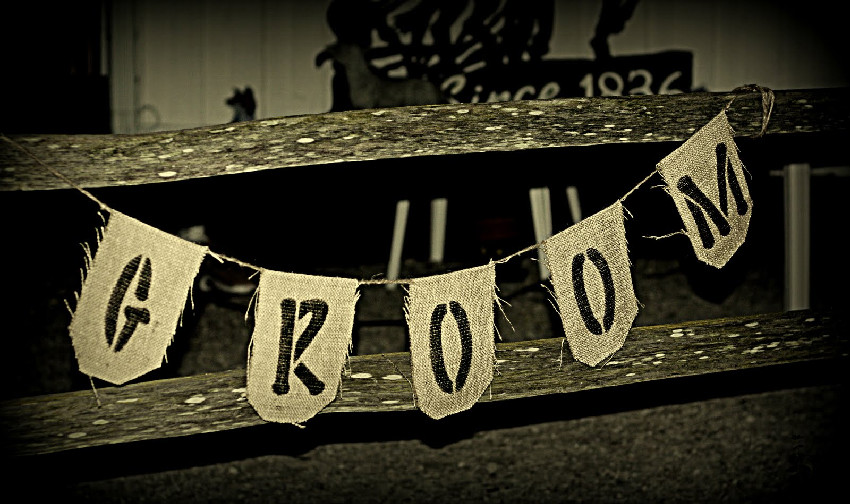 Rustic burlap Bride and Groom banners were placed on the fencing signifying which side guests should sit on.