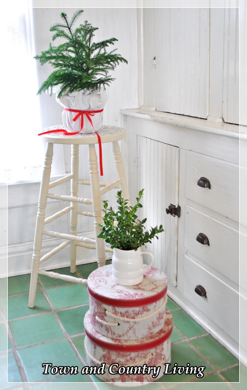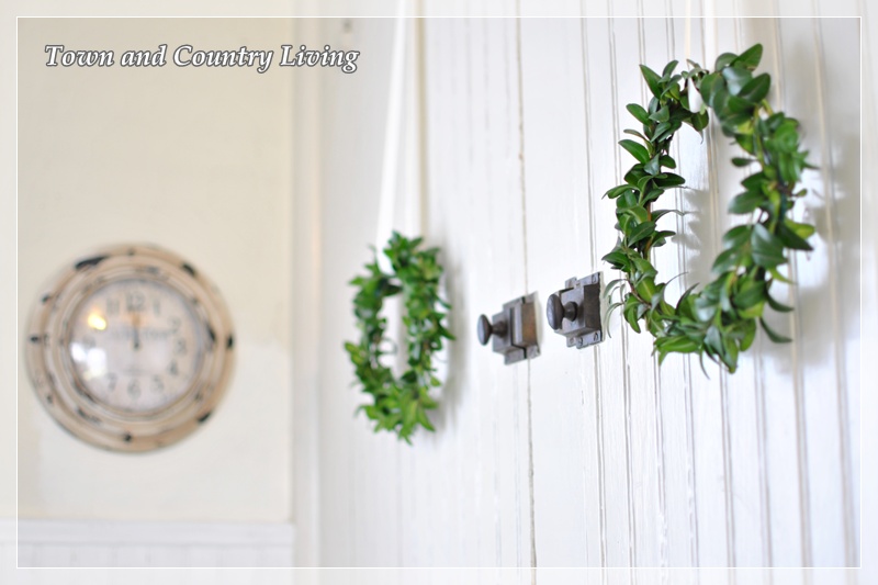 These are adorable wreaths and they look so lovely on your old cupboard doors. I love the green tree on the stool too. Simple and sweet.