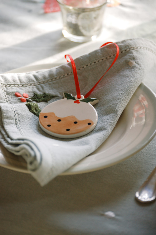 I love the sweet simplicity of this place setting. A linen napkin embroidered with holly cradles a pretty ornament.