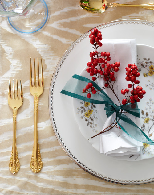 Gold flatware is making a big comeback. If you don’t have any on hand, you can find nice sets on eBay. Tie a ribbon around your napkins and tuck red berries inside for a quick and festive look.