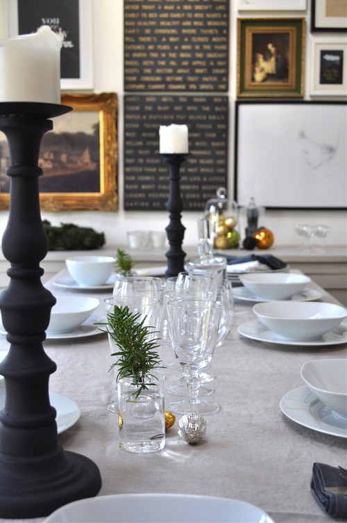Pair black candlesticks with white dinnerware to create a Fixer Upper style tablescape that would make Joanna Gaines proud. A couple sprigs of evergreens in water and a few shiny baubles complete the look.
