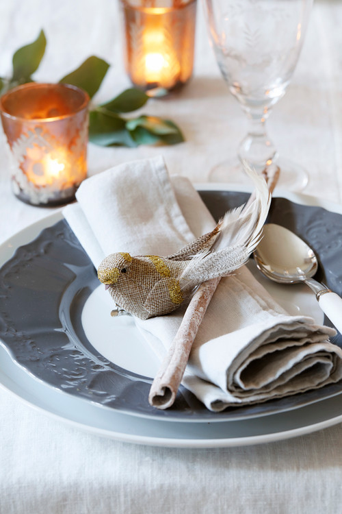 Place a clip-on bird ornament at each guest’s place setting. It looks pretty and each guest can take their bird home to decorate the Christmas tree. They’ll remember your dinner party for years to come each time they display their bird on the tree.