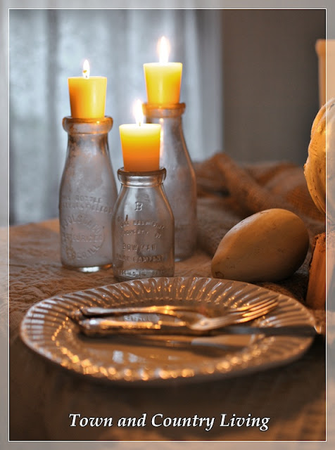 A very pretty table — love the milk bottles! We DO dine at our breakfast room table most days — there is just something to sitting down at a real table properly set that makes a meal more special!