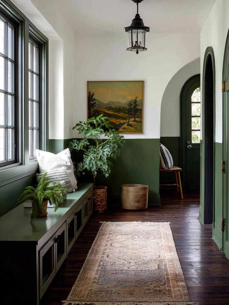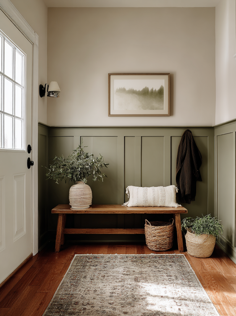 Green wainscoting paired with soft white walls creates an entryway that feels grounded. Simple furnishings, woven baskets, and greenery add warmth while keeping the palette calm and uncluttered. It immediately feels like home when crossing the threshold.