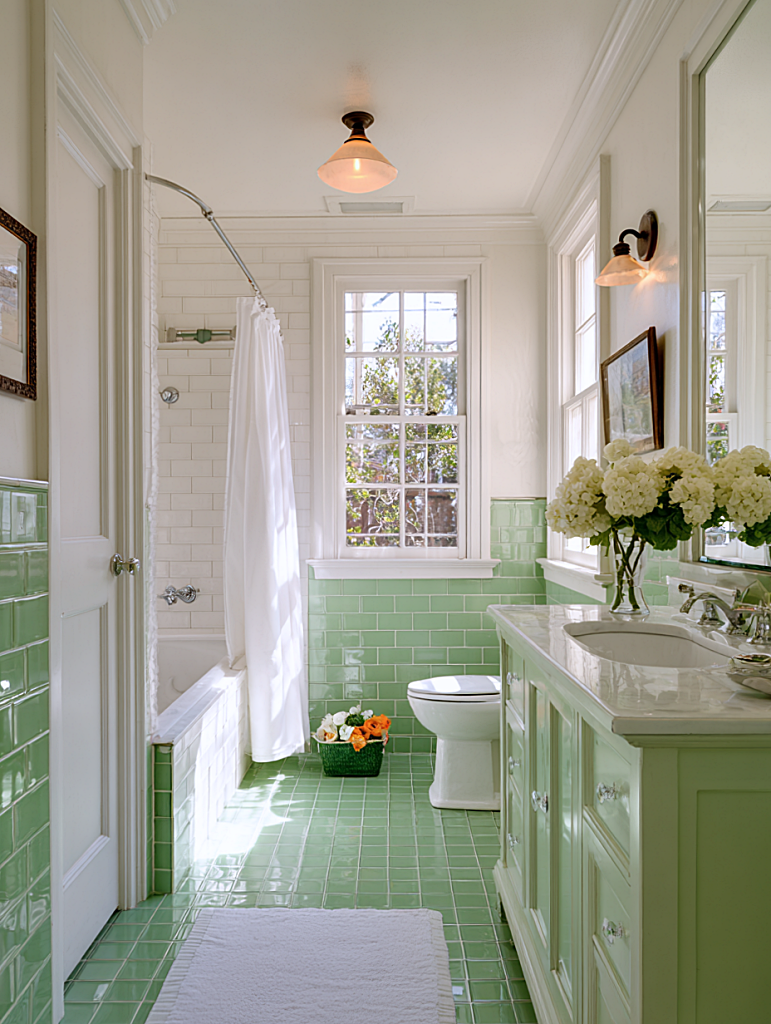 Glossy green tile combined with white subway tile and marble surfaces gives this bathroom a crisp yet charming feel. Sunlight bouncing off white finishes highlights the soft green tones and makes the space feel light and inviting. I love this space!