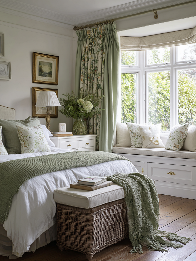 Layered green textiles against white walls bring depth and coziness to the space without overwhelming it. Floral accents and tailored drapery reinforce the connection to nature while maintaining a classic, collected look.