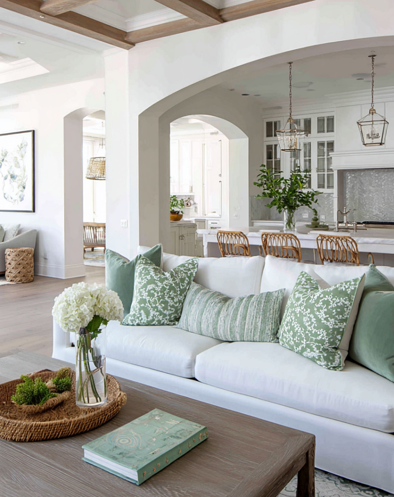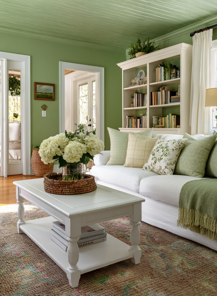 Soft green walls paired with white upholstery create a relaxed, welcoming living room that feels serene without looking stark. Natural textures, layered pillows, and botanical accents reinforce the palette’s connection to the outdoors.