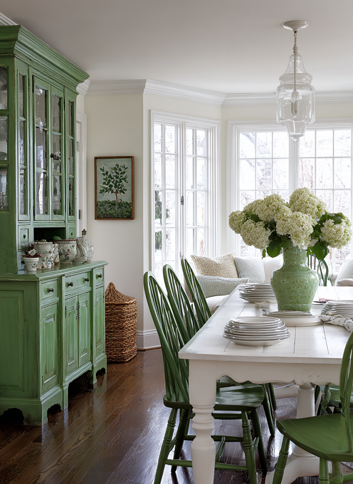 Green-painted furniture paired with a white dining table creates a fresh, farmhouse-inspired dining space that feels both cheerful and timeless. Natural light and simple place settings allow the color palette to shine without distraction.