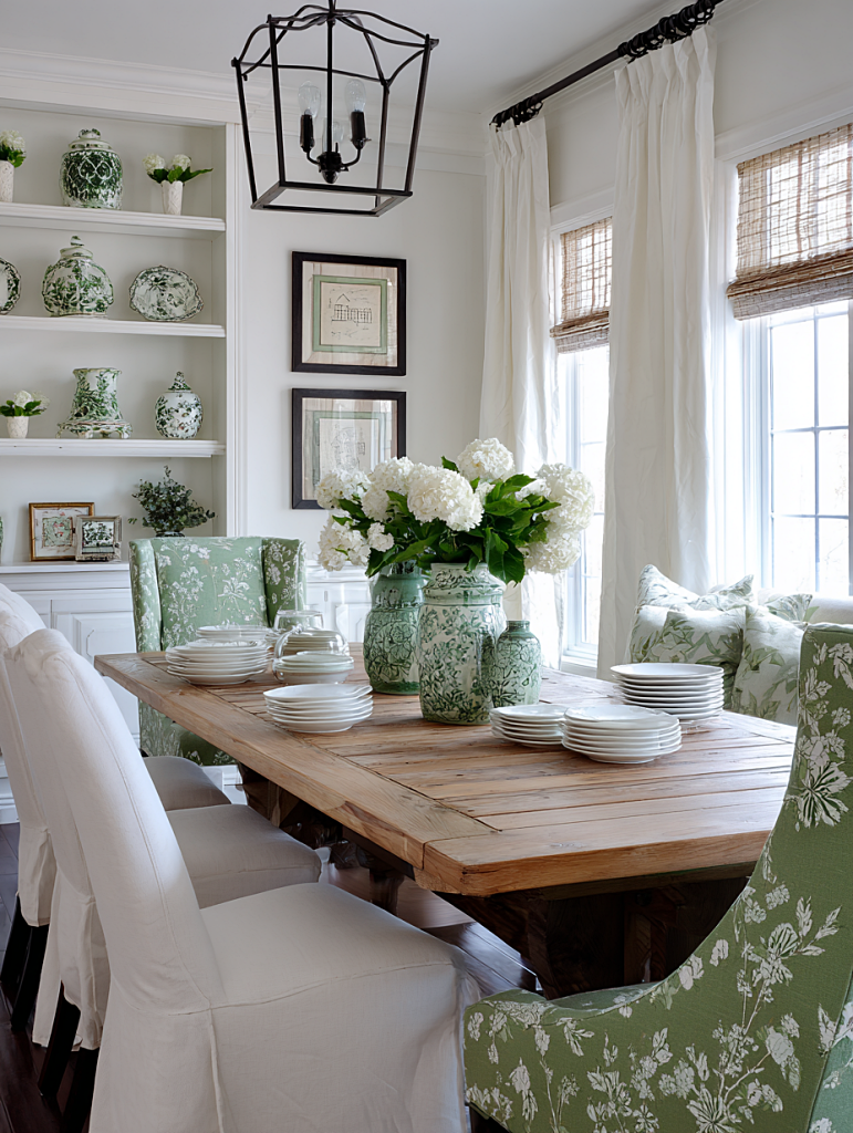 Layered greens, from cabinetry to chair finishes, bring warmth and character to this traditional style dining room while white walls and millwork keep the space feeling open. I love the beautiful pattern of the upholstered end chairs.