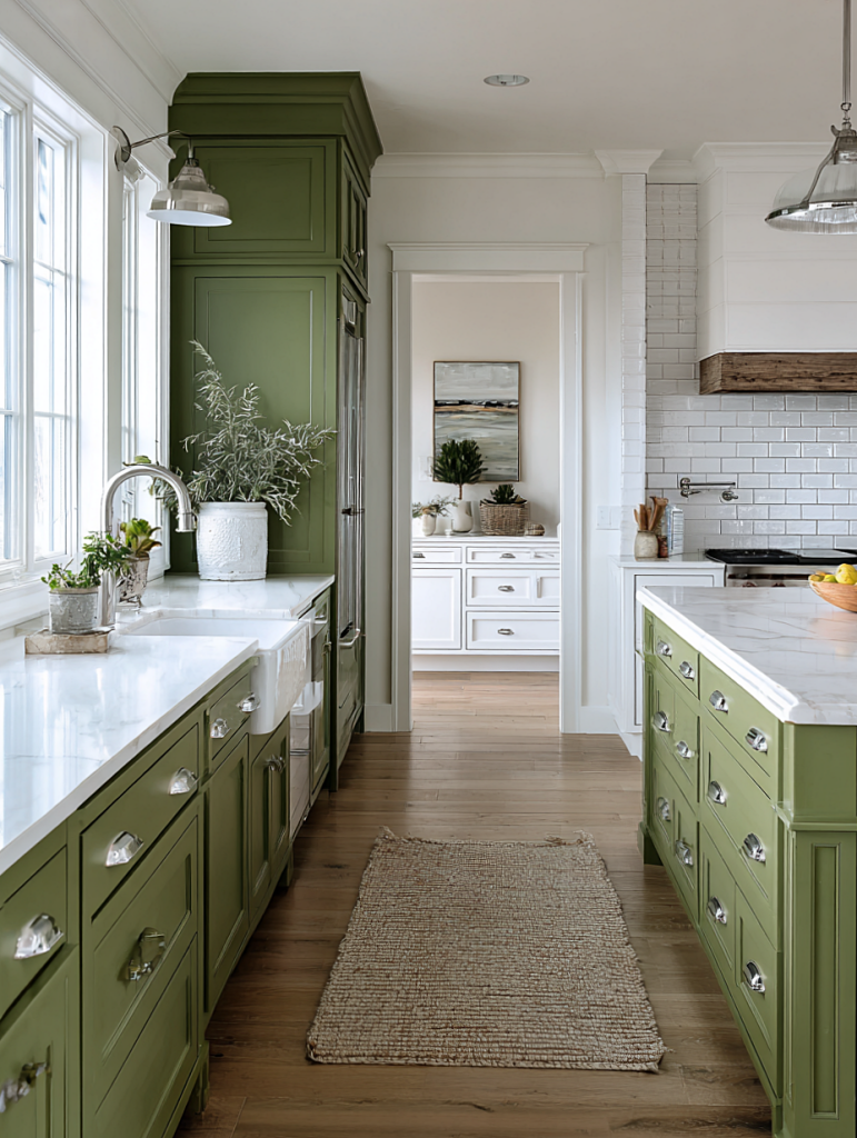 Beautiful olive green cabinetry paired with white countertops and tile creates a kitchen that feels rooted in tradition. Note how the sunlight reflects off the white surfaces, enhancing the rich green tone while highlighting the room’s craftsmanship.