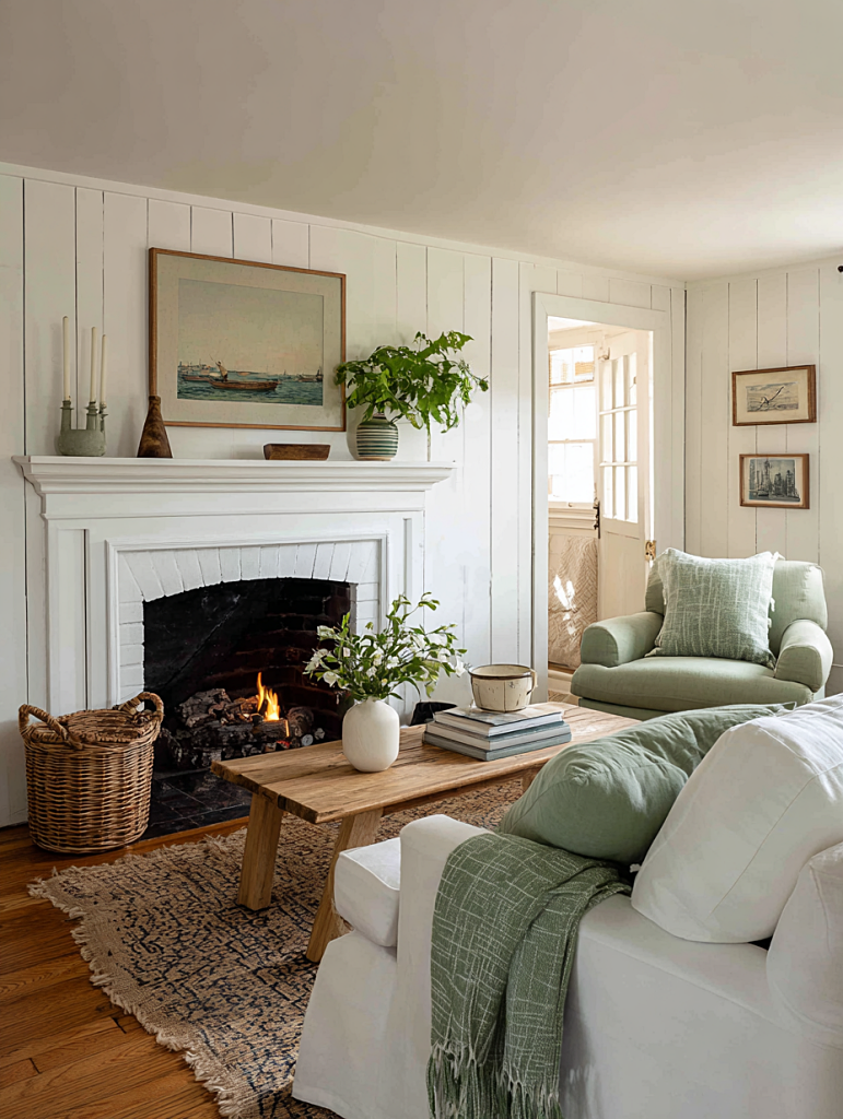 White shiplap walls and a classic fireplace provide a bright backdrop for muted green textiles and upholstered seating. Subtle pattern and warm wood tones add depth while keeping the room feeling calm and cohesive.
