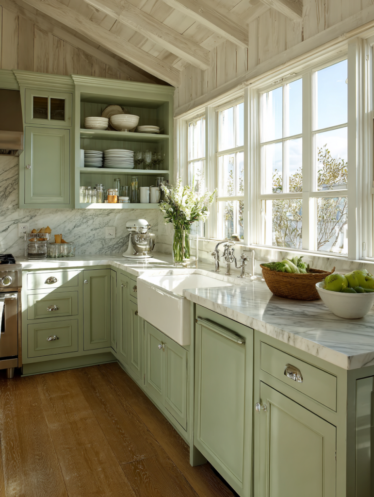 Pale green cabinetry combined with white marble counters and farmhouse details creates a light-filled kitchen with cottage appeal. You can enjoy green and white decorating if you prefer a more subdued color scheme by using a very pale green.