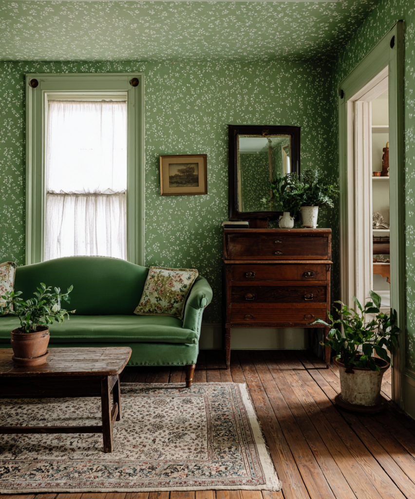 A deeper green sofa set against patterned wallpaper creates a cozy, collected look with the vintage charm you’d expect to see inside a Cotswold cottage. White trim and light-filtering window treatments balance the richness of the color and keep the room from feeling heavy.