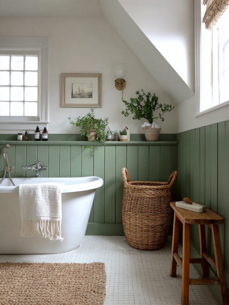 Green beadboard paired with white walls and fixtures creates a vintage style bathroom that feels fresh and spa-like. Natural textures like woven baskets, wood stools, and plants soften the space and add warmth.