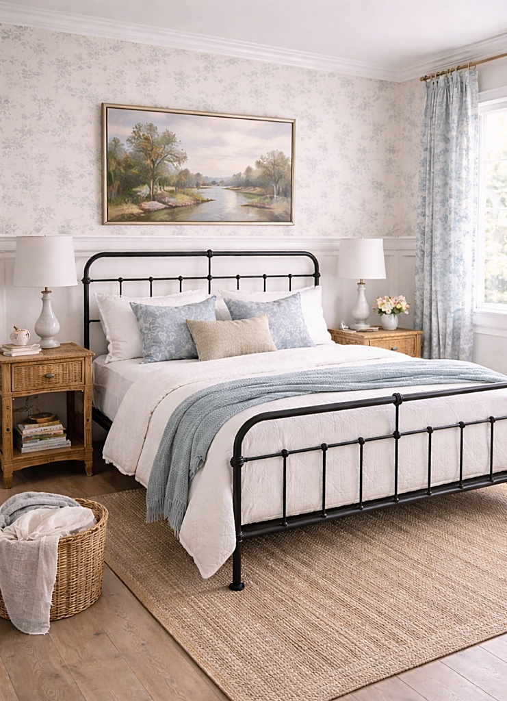 A wicker nightstand beside a metal bed introduces a subtle layer of texture in this calm bedroom. The woven surface contrasts nicely with the crisp bedding and painted wainscoting, helping the room feel balanced and serene. Consider using wicker furniture or rattan as accent pieces in any room.