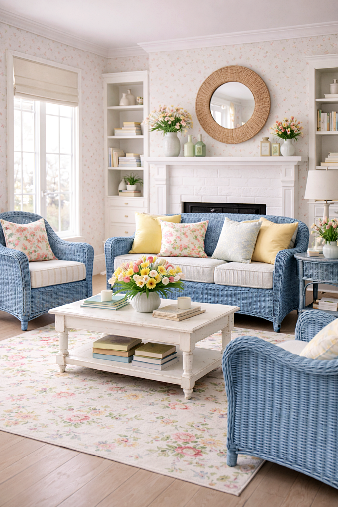 The blue wicker furniture in this cottage-style living room introduces both color and texture. Its woven structure contrasts beautifully with the painted fireplace and patterned wallpaper, giving the room a cozy, collected feel. Feels like spring, doesn’t it?