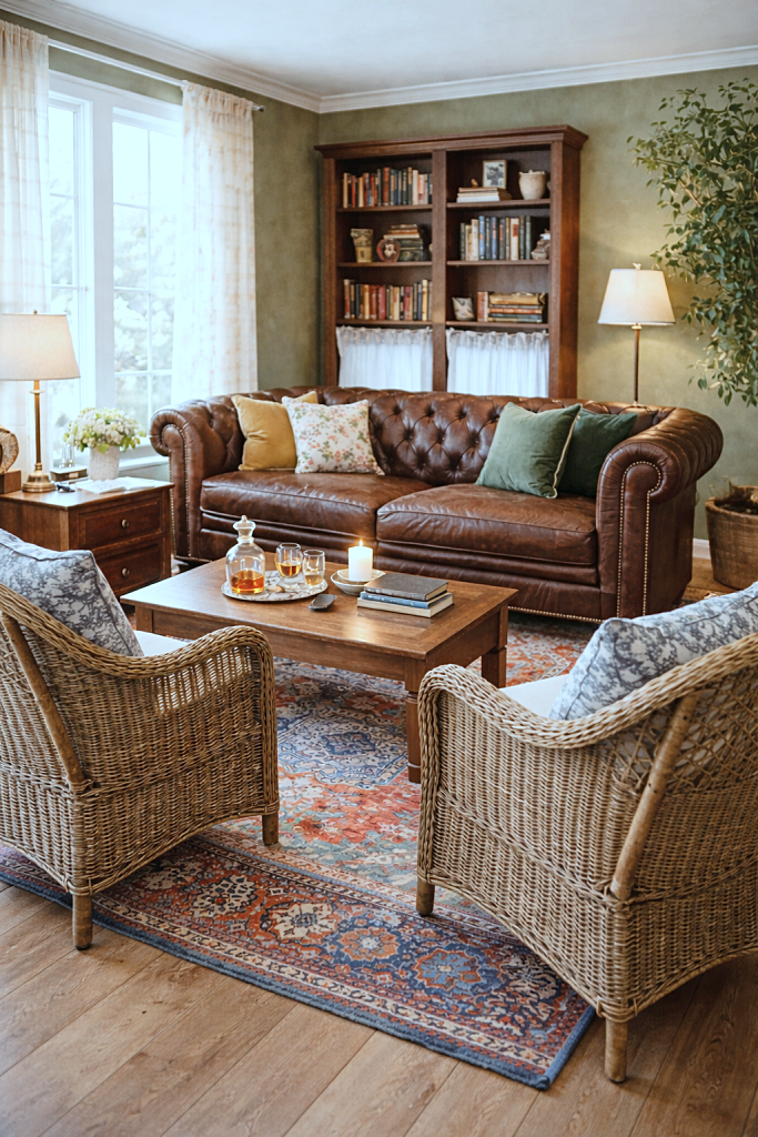 In this moody living room, wicker armchairs balance the richness of the leather Chesterfield sofa and Turkish rug. The lighter, woven material prevents the room from feeling too heavy while still adding depth and character.