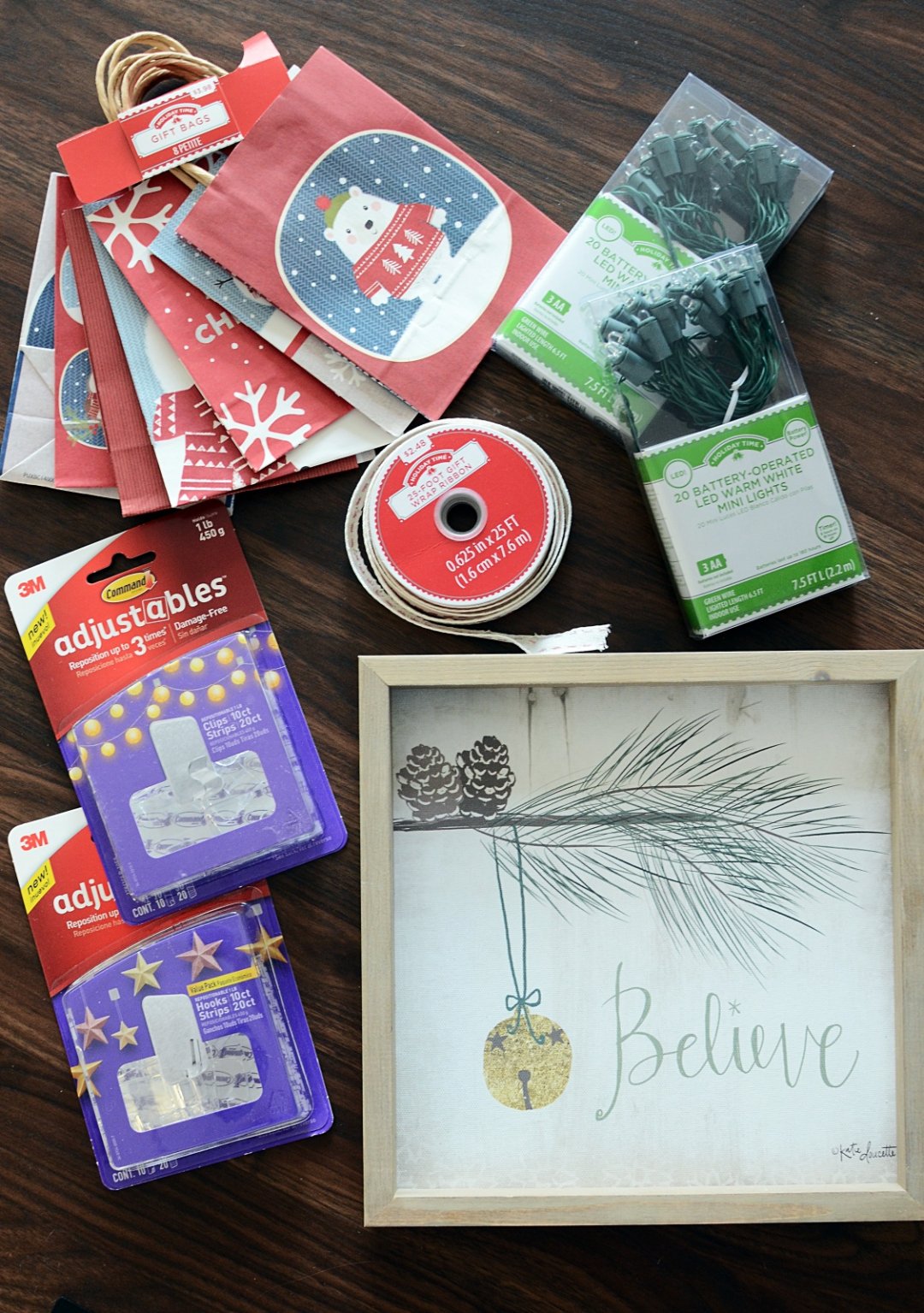 After seeing how easy it was to hang the “Believe” sign, I had the genius idea to use the Commandยฎ Adjustablesโข repositionable 1 lb hooks and Commandยฎ Adjustablesโข repositionable 1 lb clips to decorate my mantel. I found the cutest holiday print paper bags at Walmart and my wheels started spinning.