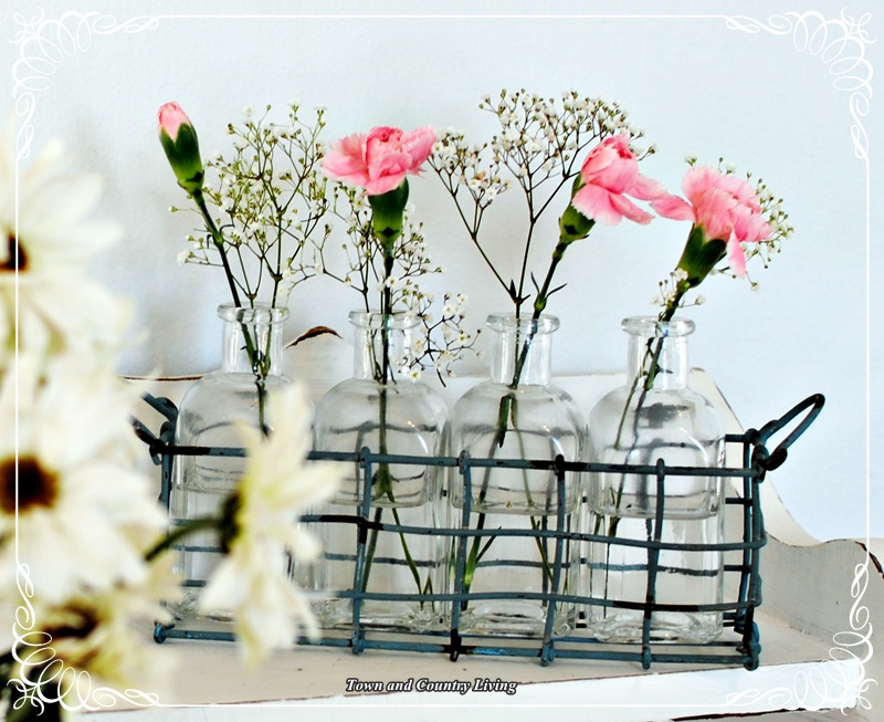So very pretty ~ I love flowers, love pink, love little bottles, love little wire carriers, love your beautiful photography!! What’s not to love?
