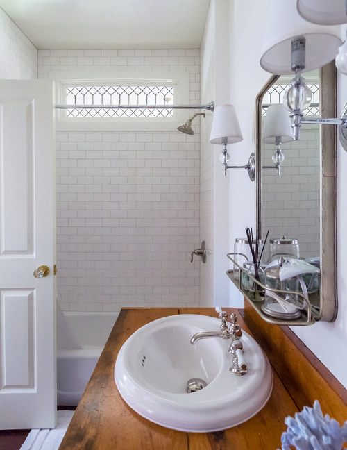 Another bathroom enjoys a lead glass window with subway tile and a wood top vanity.