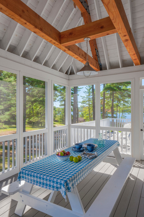A simple picnic table provides ample seating for summer family get-togethers. Screened porches allow views to enjoy nature outside, like a serene lake.