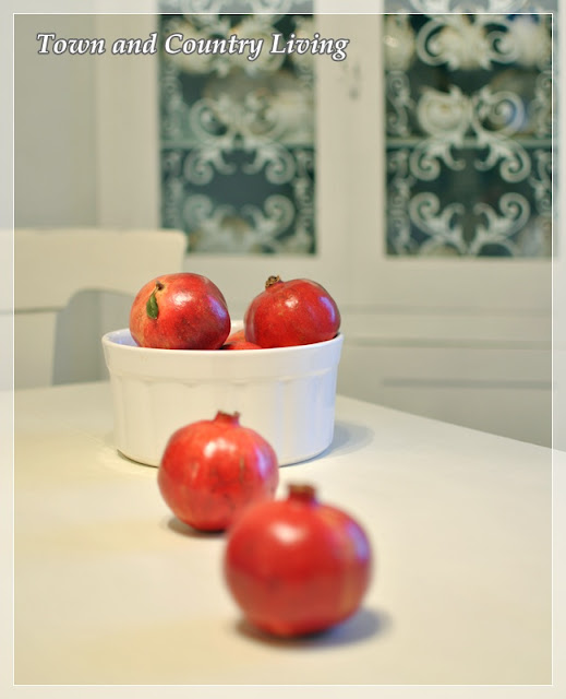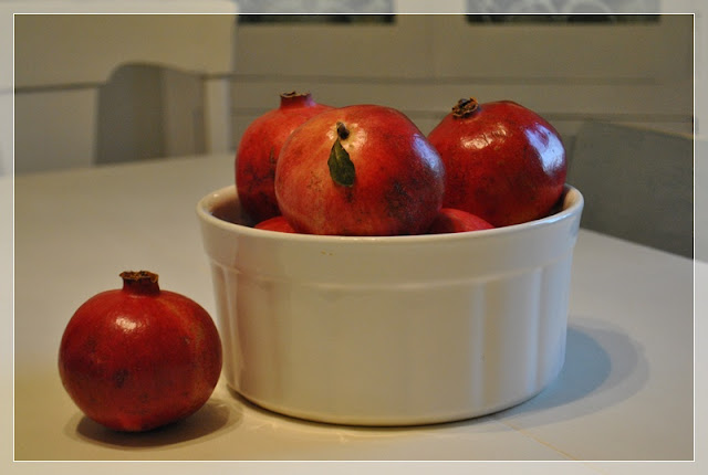 No, I’m not mad. The only red I’m seeing is a few pieces of red in the house. In about a month we’ll all be seeing a lot more red with all the holiday decorations that will be flying around the blogosphere. And speaking of blogs, November 5th is my one year blogiversary! Anywho … back to seeing red. The lovely Lucy at Craftberry Bush inspired me to pick up some pomegranates.