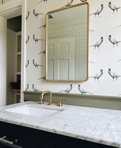Penny tile flooring pairs with pheasant wallpaper in the quaint bathroom with a colorful Turkish rug. Note the magazine holder above the toilet paper dispenser. A simple brass faucet pairs with a marble counter top on the vanity lending just a bit of elegance to the space while olive green beadboard keeps the cottage vibe.