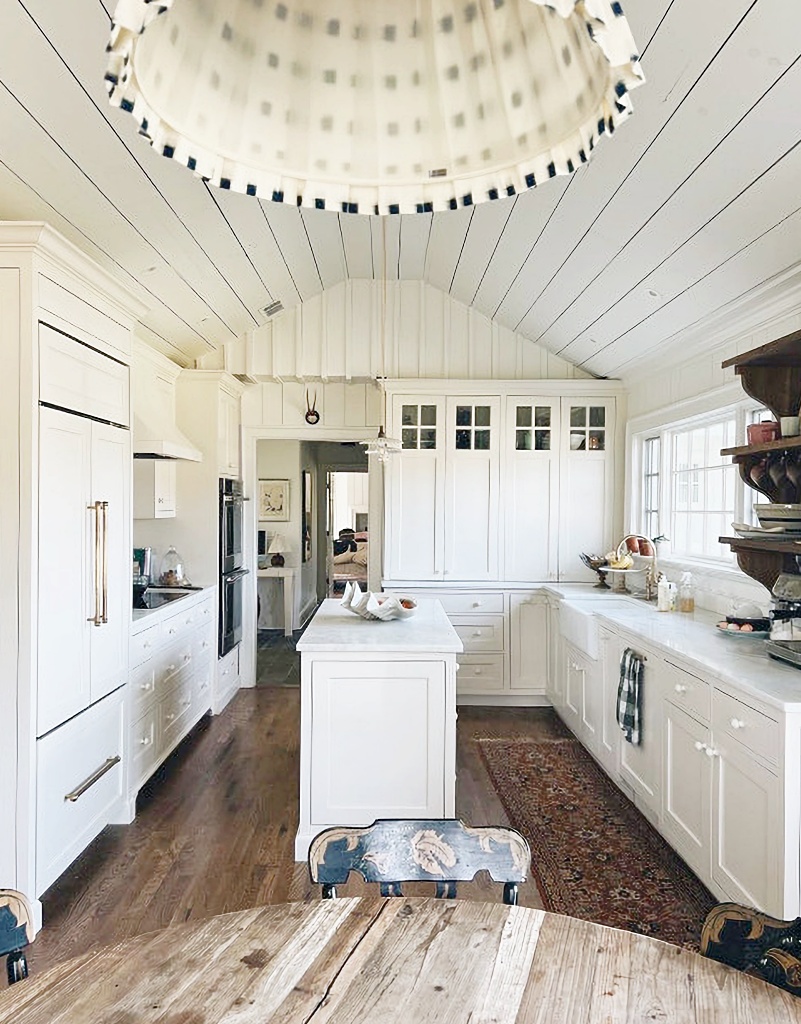 The dining nook is charming with the same wall and ceiling treatment as the kitchen. A round table softens the square room (making the shape a better choice than a square or rectangle table). A simple pendant light adds a touch of softness while a pair of prints flanking the window lend a bit of color.