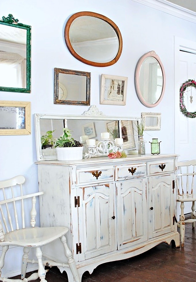 Mirrors are one of the oldest tricks in the book for small space decorating. A well-placed mirror reflects light and visually doubles the room. Consider hanging a larger mirror opposite a window or incorporating subtle reflective elements like glass lamps or mirrored trays. Several years ago, I created a gallery wall of vintage mirrors in my small dining room to visually expand the space. This wall is directly opposite a window and so was a great solution to add more light and the feeling of spaciousness.