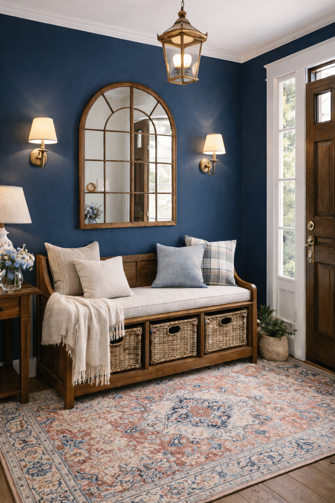 Here, an entryway makes great use of this concept with a comfy bench that includes storage. Note how the walls are dark blue – don’t shy away from deeper colors for small space decorating. It can add to the cozy ambiance.