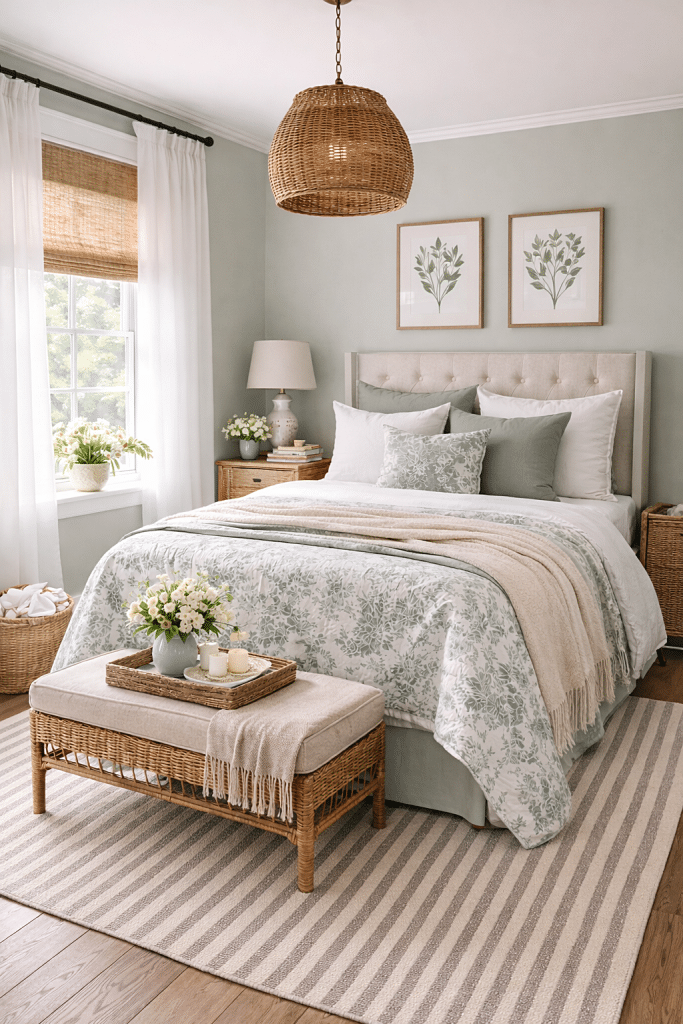 Light walls like soft whites, pale grays, muted sage, or gentle blues reflect natural light and make a room feel more open. Layer in depth with texture like woven baskets, linen curtains, patterned pillows, and perhaps one jewel-toned accent for warmth. A small room shines when it feels thoughtfully layered – like repeating textures such as the bamboo shade and rattan pendant light.