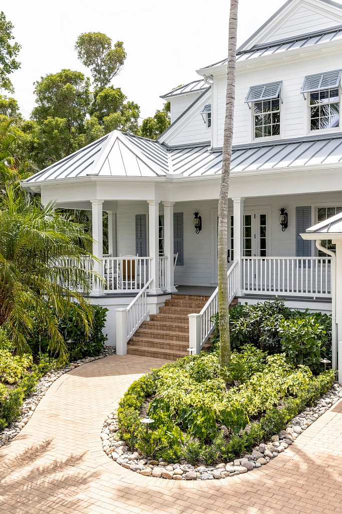 Today’s tour starts with a classic coastal faรงade that welcomes you with crisp white siding, metal roofing, and a gracious wraparound porch. Surrounded by layered tropical landscaping and a winding brick path, the home feels both refined and perfectly at ease in its Florida setting.