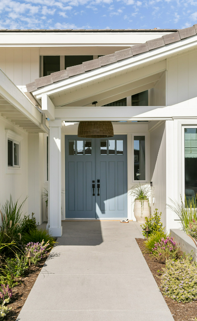 Just beyond, a stunning butlerโs pantry in the renovated California home adds both style and utility. Painted in a calming shade of blue, it brings a touch of personality to the neutral palette while maintaining the homeโs serene flow. Open shelving, woven baskets, and polished brass hardware make the space equal parts practical and elegant.