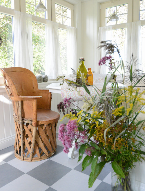 The porch is surrounded by windows that let in plenty of natural light, which is so important during the short gray days of winter. White walls and ceiling bounce the sun around, maximizing the light in the room. Simple curtains and a checkerboard floor provide a cottage touch.