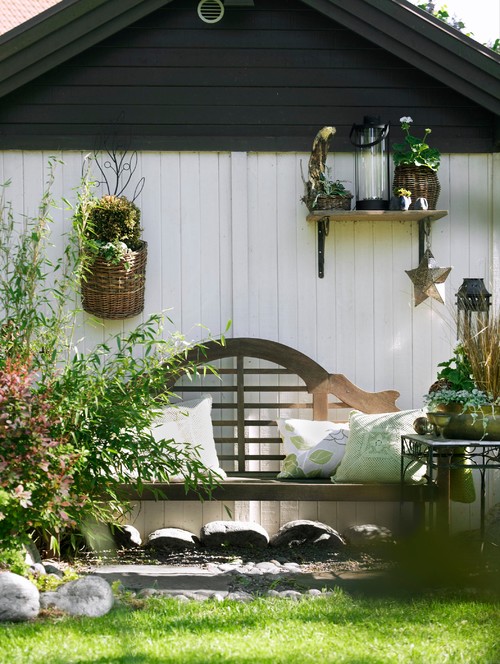 Step outside the Swedish villa and you’ll find pretty outdoor living spaces. A simple bench with plump pillows invites you to take a break from gardening chores.