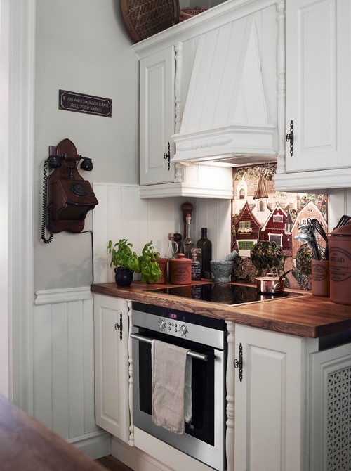 I had no idea what Swedish design looked like. Love that corner stove and the spindle dรฉcor around the kitchen cabinets. It adds a lot of character.