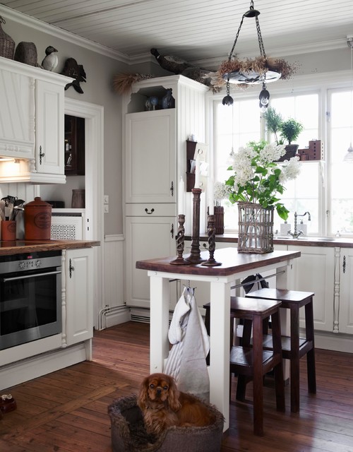 Step inside the kitchen of this Swedish villa and enjoy the custom cabinets and bead board ceiling. A simple kitchen island creates a convenient place for dining. Puppy seems to enjoy his spot in the kitchen.