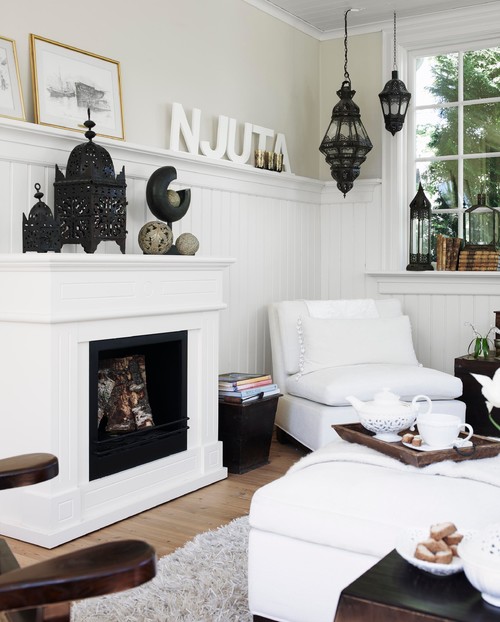 Boho chic lanterns populate the living room with its pretty fireplace and bead board walls. They remind me of the lanterns I recently shared on my front porch. ย Black and white decor is becoming more popular, as you see this color combo used a lot in the show, Fixer Upper.