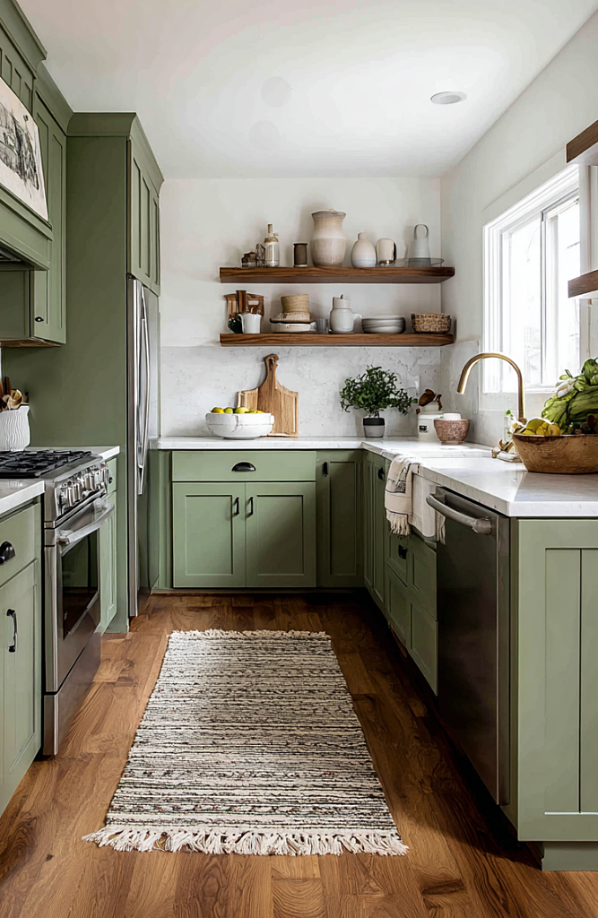 Sage green cabinets bring a natural, grounding element to this compact kitchen. Open wood shelves and a warm brass faucet soften the look.