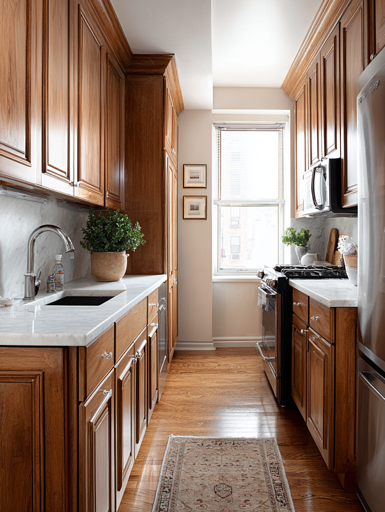 Classic wood cabinets paired with marble countertops create a timeless look that feels both practical and polished. The galley layout maximizes counter space while maintaining clear walkways.