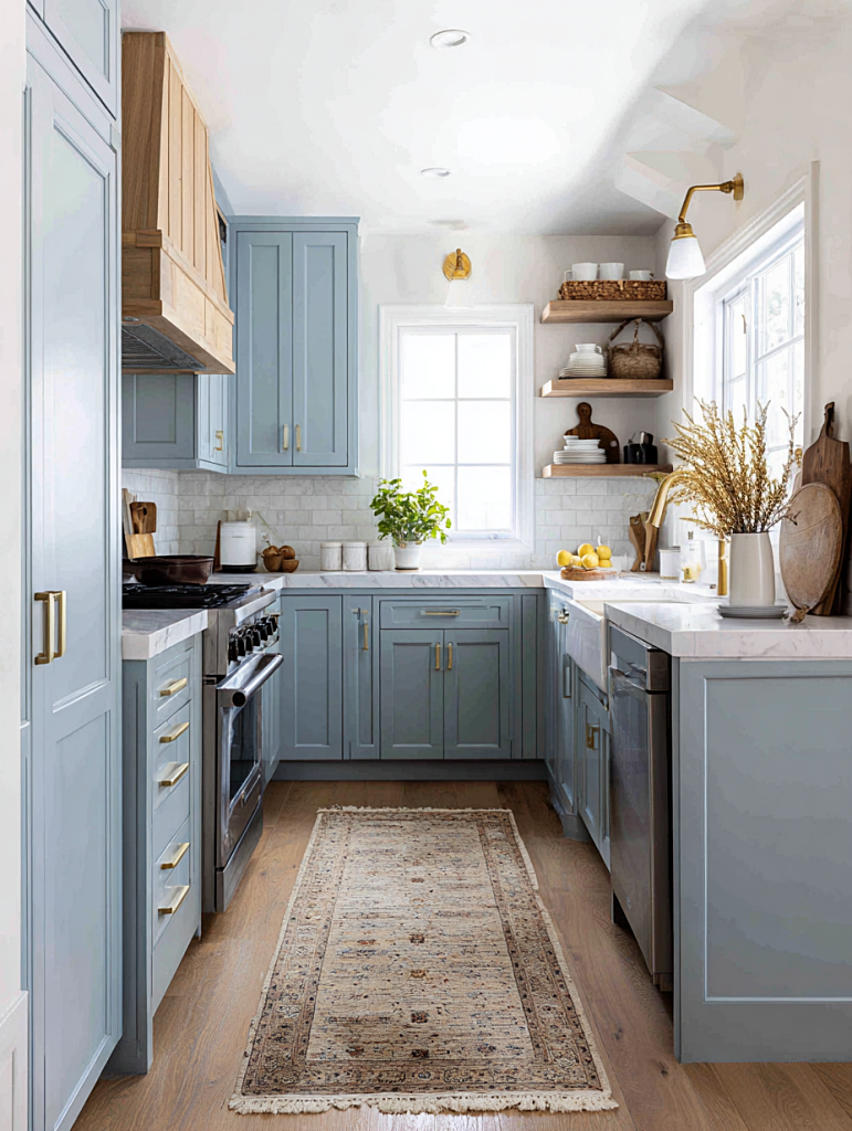 Dusty blue cabinetry combined with brass hardware adds subtle elegance to this small kitchen design. Open shelving and light countertops keep the space feeling light and visually balanced.