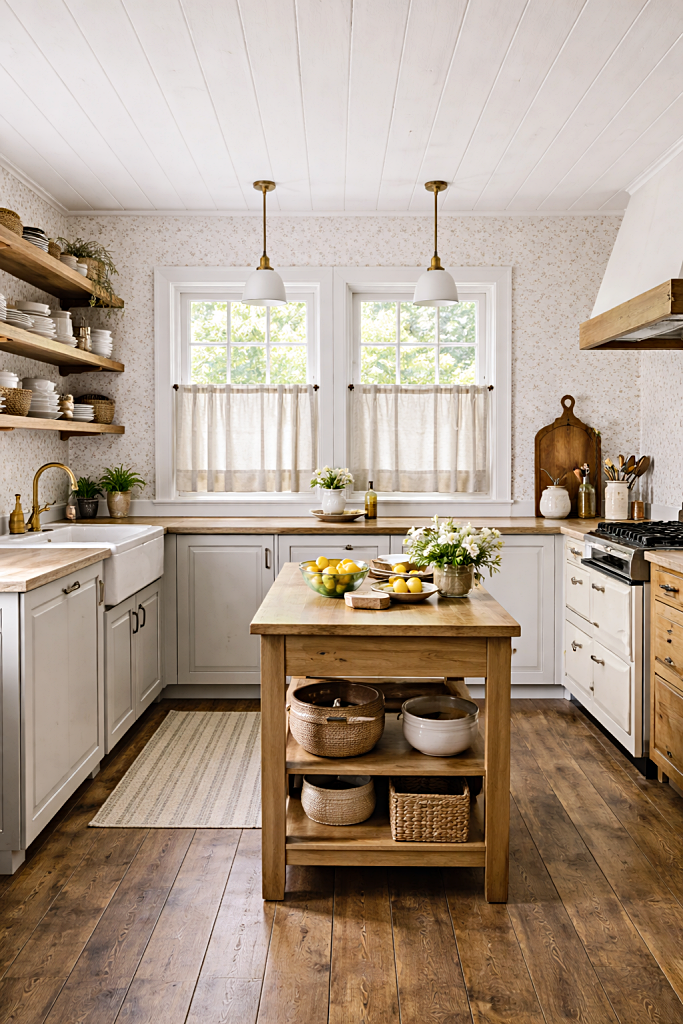 In a cottage-style kitchen with open shelving, the worn-in wood floor adds a sense of history and charm, perfectly complementing butcher block counters, vintage-inspired accessories and a small print wallpaper.