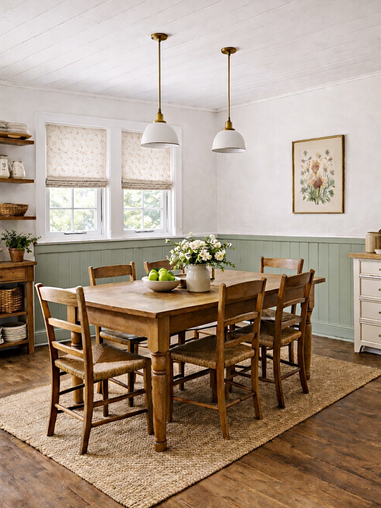 The sage green paint on this dining room’s wainscoting looks very similar to the color I chose for my upstairs hall and staircase (can’t wait to show it to you!). It hugs this farmhouse nook with mostly wooden features – including the floor.