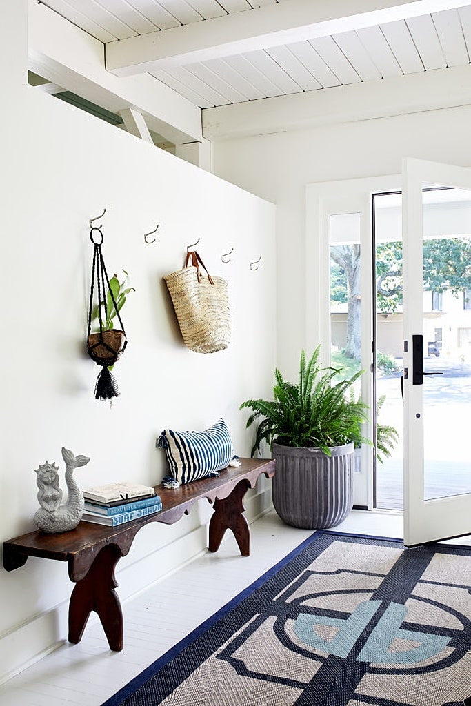 Gibson Island is private and not very large. It’s 1000 acres at two miles by three miles in size. You’ll find beautiful houses like today’s beach home washed in coastal colors. White ceiling beams feature blue bead board, reminiscent of the ocean sky.ย